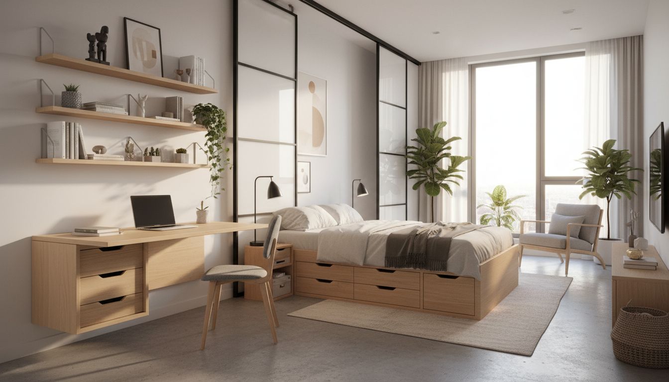 - Vertikaler Stauraum und modulare Systeme ersetzen sperrige Schränke.