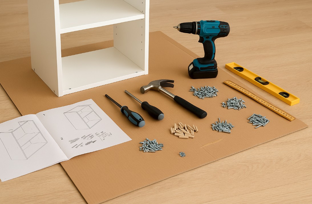 Ohne geeignetes Werkzeug wird selbst ein einfacher Schrank zur Geduldsprobe. Ein Kreuzschlitzschraubendreher und ein Inbusschlüssel gehören fast immer dazu, da viele Möbelhersteller diese Schraubenarten verwenden. Ein Hammer hilft beim vorsichtigen Einschlagen von Holzdübeln oder kleinen Nägeln für die Rückwand, sollte aber mit Gefühl eingesetzt werden.