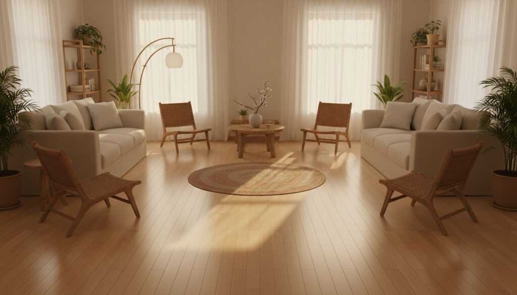 Achten Sie darauf, keinen massiven Couchtisch direkt in den Mittelpunkt zu stellen, um den Energiefluss nicht zu blockieren. Stattdessen kann ein runder Teppich in Erdtönen oder eine dezente Bodenleuchte die Mitte sanft betonen, ohne sie zu beschweren. So schaffen Sie eine energetische Balance, die Ruhe und Stabilität in Ihren Alltag bringt.