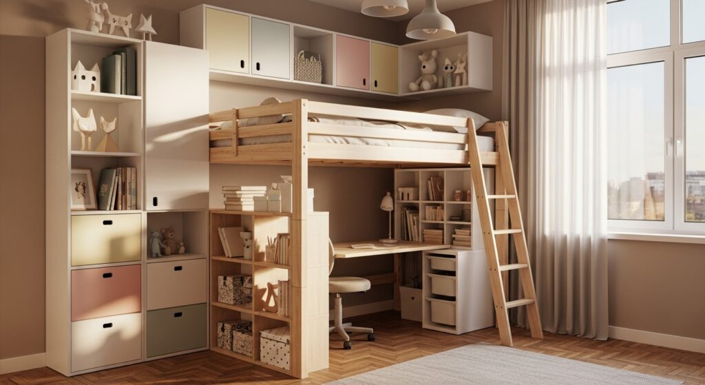| Hochbett / Etagenbett | Gewinnt Nutzfläche darunter | Ideal für Schreibtisch oder Spielecke |