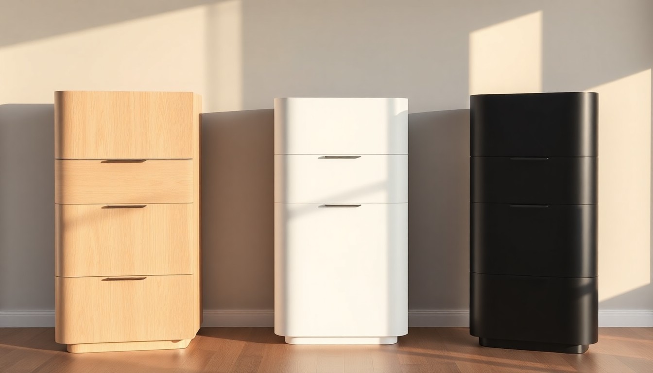 - Hohes, schmales Möbelstück mit mehreren Schubladen.