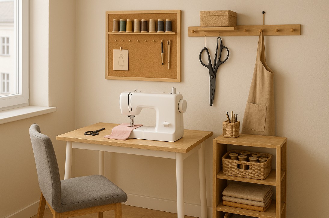 Ein gut geplantes Layout kann selbst engste Räume optimal nutzbar machen. In kleinen Wohnungen eignet sich eine Nische oder ein Fensterausschnitt ideal als Nähecke. Ein klappbarer Tisch ermöglicht es, den Arbeitsbereich nach Gebrauch verschwinden zu lassen. Ein Rollwagen, der unter den Tisch geschoben wird, sorgt für Stauraum und Flexibilität.