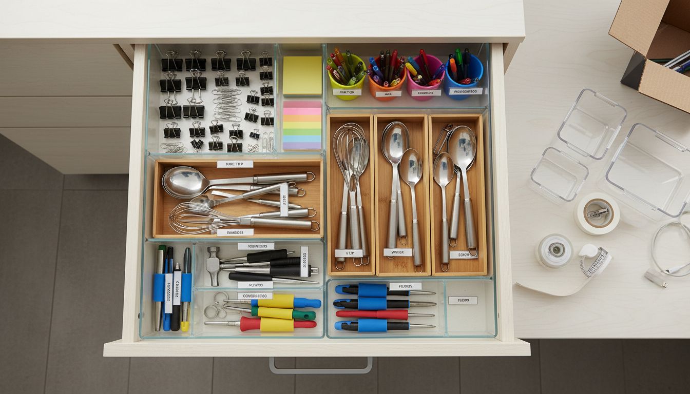 Schubladen organisiert man richtig, indem man sie vollständig ausräumt, Inhalte kategorisiert, Maße nimmt und passende Organizer nutzt. Beschriftungen, Farbcodes und regelmäßiges Nachsortieren sorgen dauerhaft für Übersicht.