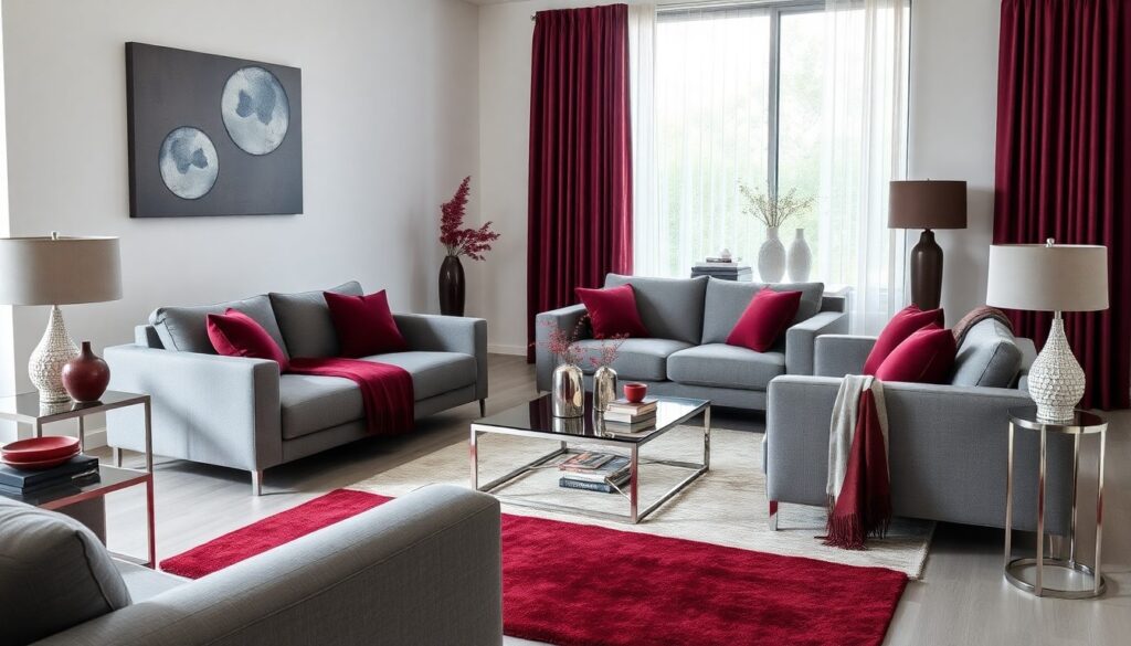 Auch Burgunderrot oder dunkles Rot wirkt stilvoll und gemütlich und sorgt für einen leicht dramatischen Effekt, wenn es bewusst dosiert eingesetzt wird. Wichtig ist, kräftige Farben punktuell zu verwenden. So bleibt der Raum harmonisch und wirkt nicht zu intensiv. Da Grau neutral ist, kommen Kontraste besonders gut zur Geltung.